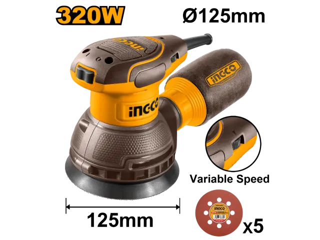 LIJADORA ROTO ORBITAL 125MM 320W-Voltaje: 220-240V~50/60Hz-Potencia de entrada: 320W-Velocidad sin carga: 8000-13000rpm-Diámetro de la almohadilla de lijado:125mm-Base con velcro-Control de velocidad variable-Con 5 piezas de papel de lija (AKRS125051)-Con 1 juego extra de escobillas de carbón
