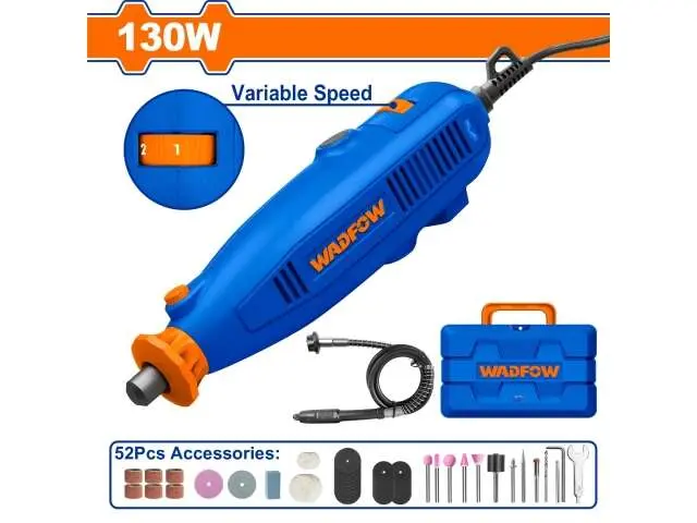 -Voltaje: 220-240V~50/60Hz -Potencia de entrada: 130W -Velocidad sin carga: 8000-35000 rpm -Tamaño de la pinza: 3,2/2,3 mm -control de velocidad variable -Incluye: *1 Uds eje flexible *52 Uds accesorios Embalado en estuche de transporte